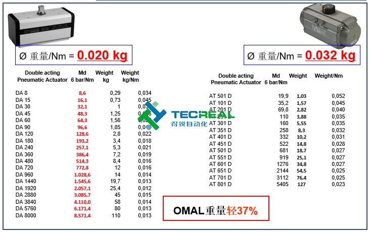 首先來(lái)看雙方的雙動(dòng)版本,從測(cè)試中可以看到OMAL的? 重量/Nm = 0.020 kg,而Air Torque執(zhí)行器? 重量/Nm = 0.032 kg。OMAL重量輕37%。