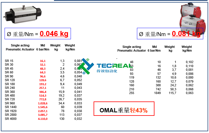 同樣我們先看雙動(dòng)型,OMAL的? 重量/Nm = 0.020 kg,而B(niǎo)ray? 重量/Nm = 0.031 kg,從上面的結(jié)果可以看出,OMAL撥叉式氣動(dòng)執(zhí)行器重量比對(duì)方輕35%。重量輕,則代表體積也小,那么在客戶安裝和維修的時(shí)候也會(huì)更加方便。