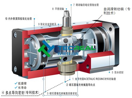 壓縮空氣進(jìn)入氣缸,推動(dòng)齒條式活塞直線運(yùn)動(dòng),齒條與齒輪軸上的齒輪嚙合帶動(dòng)齒輪軸旋轉(zhuǎn)運(yùn)動(dòng)從而實(shí)現(xiàn)對閥門的控制。