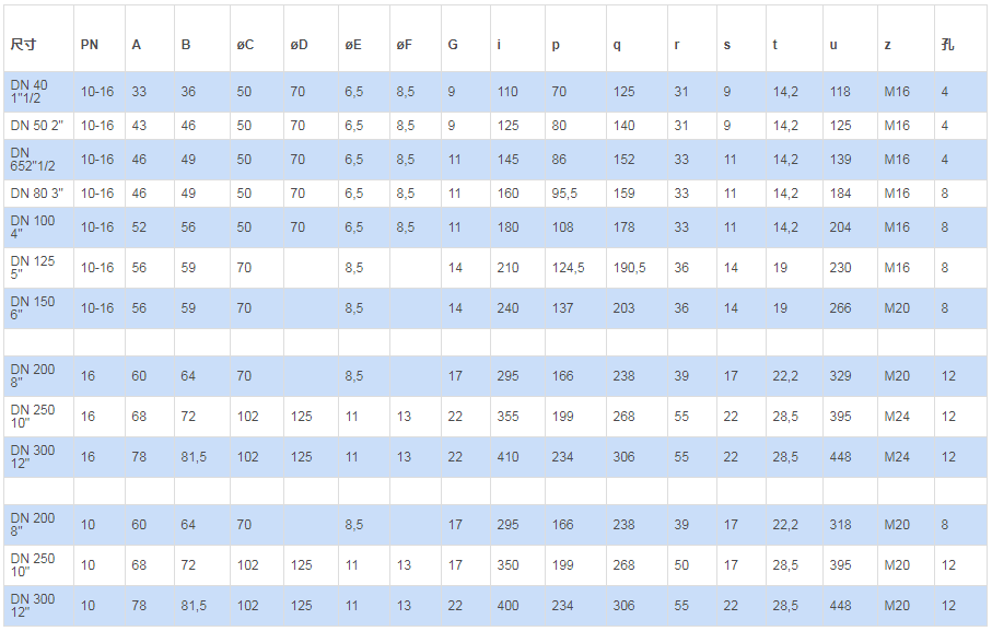 法蘭標(biāo)準(zhǔn):PN 10=PN 16 公稱通徑從 DN 40 至 DN 150; PN 10 或 PN 16公稱通徑從DN 200 至 DN 300。